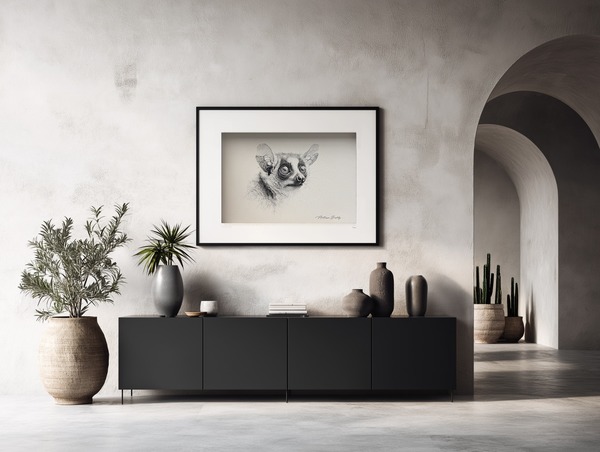 A tender homage to the nocturnal soul of the African night. This delicate graphite drawing captures a bushbaby cradled in moonlight, watchful, secretive, and full of quiet wonder. Nagapie (Afrikaans for “little night monkey”) stands as a guardian of dreams and shadows, a small creature entrusted with the gentle light that guides us through the night.